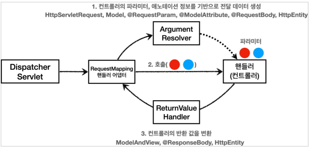 2. HandlerMethodArgumentResolver(ArgumentResolver)는 파라미터의 값이 모두 준비되면 핸들러(각 컨트롤러)에게 값을 넘겨준다.